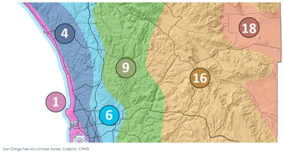 The California Irrigation Management Information System (CIMIS) divides San Diego County into six climate zones: Coastal, Coastal Inland, Upland Central, Transition, Mountain and Desert.